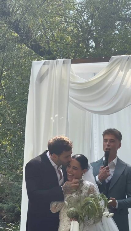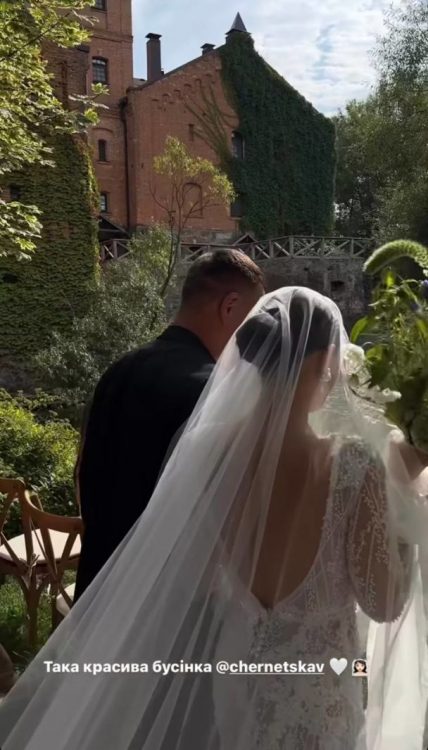 Молодята обмінялися обітницями на тлі стильної арки, прикрашеної легкою білою тканиною. Перед камерою Роман Свечкоренко постав у стильному костюмі чорного кольору. Його наречена позувала у розкішній сукні з вишитим рослинним орнаментом. Свій образ кохана психолога доповнила пишною фатою.