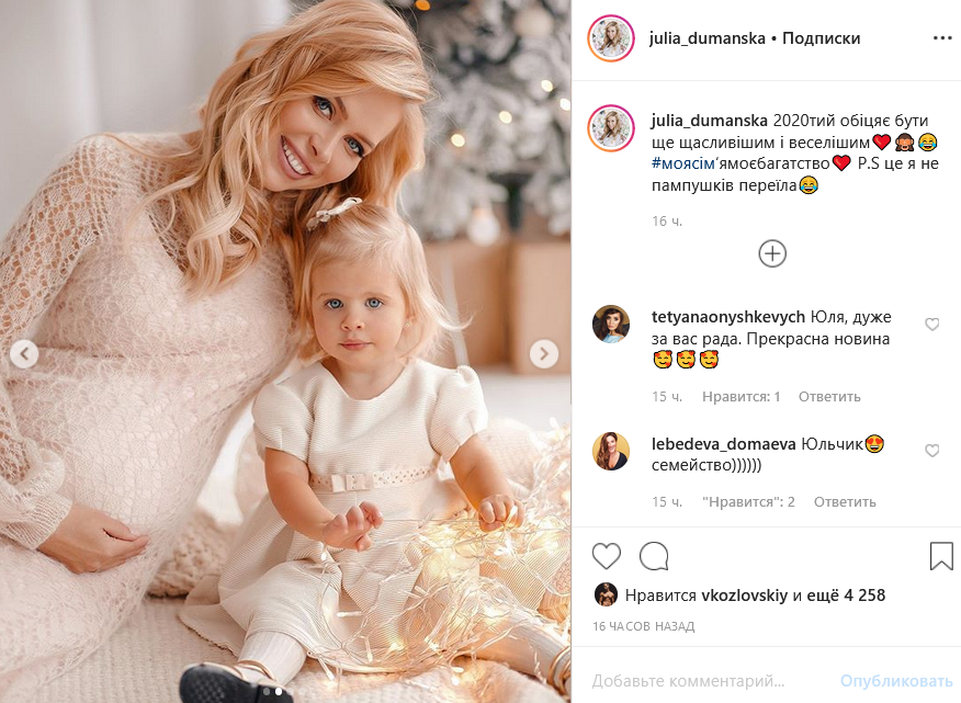 Про свою вагітність артистка оголосила на особистій сторінці в Instagram, опублікувавши милі сімейні фото. На знімках Юлія відображена з помітним животиком в оточенні чоловіка, бізнесмена Григорія Козловського. У кадрі також присутні діти подружжя – дочка Діана і дочка Григорія від попереднього шлюбу.