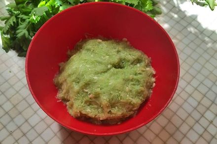 Молоді кабачки натираємо на тертці й переміщуємо в окрему глибоку тарілку. Додаємо трішки солі й чекаємо 15 хвилин, щоб вийшла зайва волога.