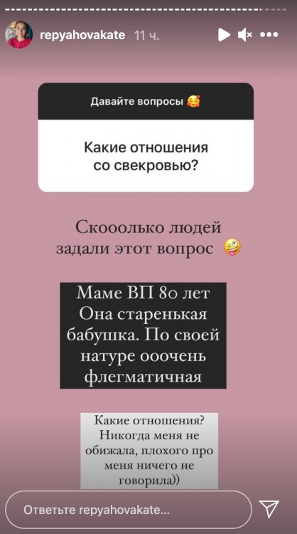 В InstaStories Катерина Реп’яхова із задоволенням відповіла на запитання фоловерів. За словами жінки, вона перебуває у хороших стосунках з мамою артиста. Також жінка заявила, що свекруха ніколи не говорила про неї нічого поганого. А ще Катерина Реп’яхова назвала маму Віктора Павліка дуже флегматичною.