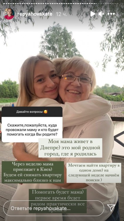 Також підписників дуже цікавить, хто після народження дитини допомагатиме Катерині з малюком. Жінка зізналась, що в перший час з нею буде мама. Вона живе в Дніпрі, проте, через декілька днів переїде в Київ.