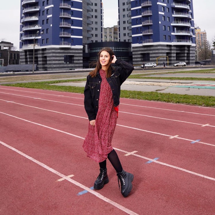 Однак повернемося до образу Джамали. Співачка позує у вільній сукні довжини міді, яка приховує її кругленький животик. На бордовому тлі — строкатий білий принт. На плечі накинута злегка об’ємна джинсова куртка чорного кольору. На ніжках — чорні колготки і грубі черевики на масивній платформі. Зазначимо, що грубі черевики все ще залишаються трендом сезону. Такий бунтарський стиль відмінно підійде для прогулянки по місту або парку.