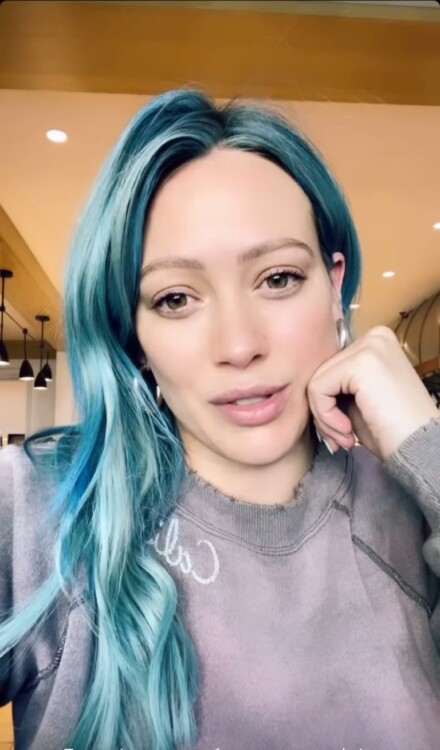 Сам процес зміни кольору шевелюри артистки зайняв практично цілий день. Крім того, Дафф написала, що блакитний колір волосся – це зовсім не натяк, що у неї народиться ще один син.