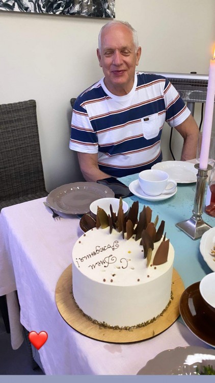 Майбутня мама влаштувала для батька справжнє свято. Вона накрила для нього розкішний стіл, який прикрасила білими піонами. Також для іменинника Катерина Осадча підготувала красивий торт.
