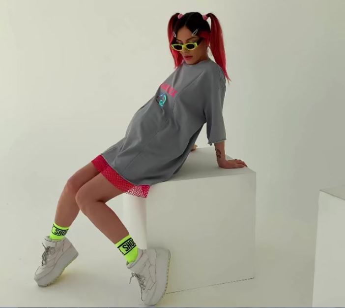 На одному з фото MamaRika позує у спортивному образі. Вона одягнула стильну сукню-футболку сірого кольору. Свій незвичний образ жінка доповнила білосніжними кросівками та сонцезахисними окулярами.