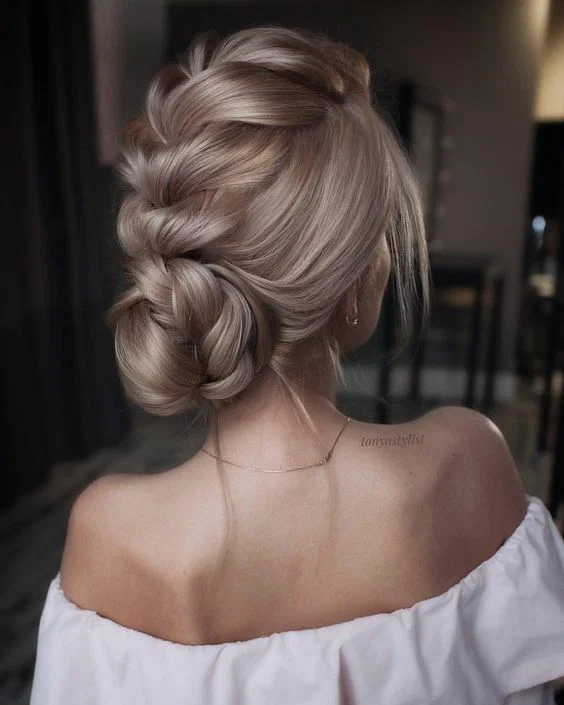 Ажурна коса, що плавно переходить у низький пучок — елегантний варіант зачіски для вечірнього заходу. Зробити таку красу зможе красуня, як з довгим волоссям до пояса, так і жінка зі стильною стрижкою каре середньої довжини.