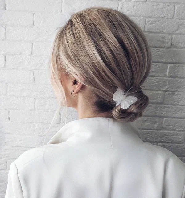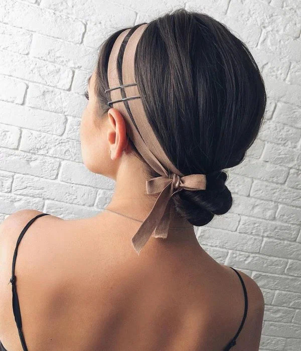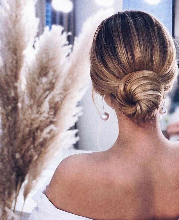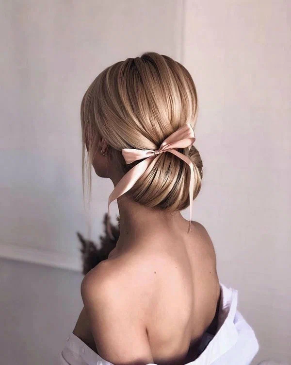 Гладкий пучок – зачіска, яка не має собі рівних. Виглядає цей варіант максимально охайно та ефектно. Пучок у такому мінімалістичному виконанні підходить під різне стилістичне вбрання, починаючи від вечірньої сукні в підлогу і закінчуючи строгим брючним костюмом. Атласна стрічка, використана як шпилька або гумка, додасть витонченості сучасній зачісці.