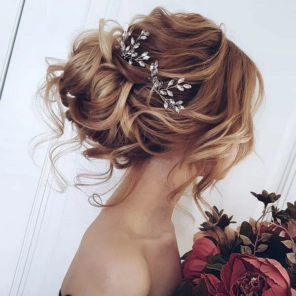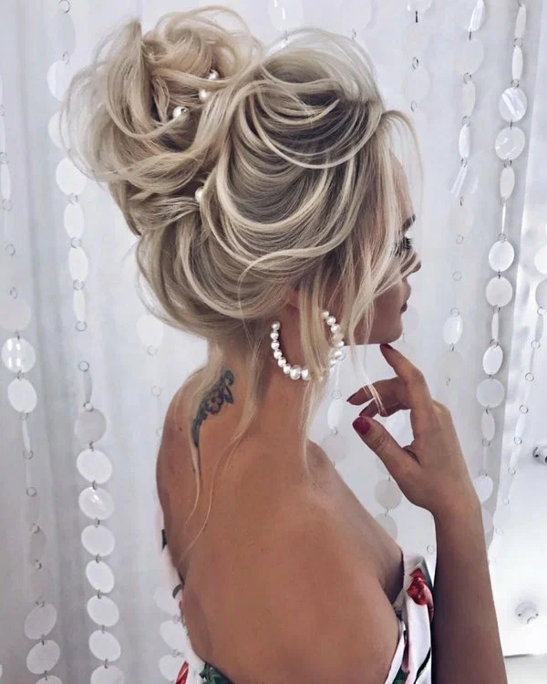 Текстурований варіант високого пучка з елегантними хвилями підійде для певного тематичного заходу. Такого плану зачіску можна прикрасити шпильками із перлинними бусинами. Щоб образ виглядав завершеним, передні кілька пасм краще залишити розпущеними біля обличчя.