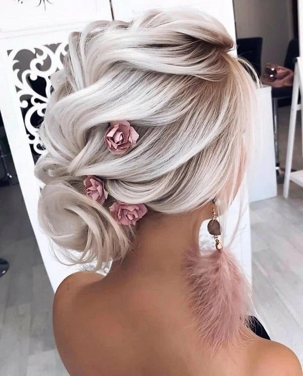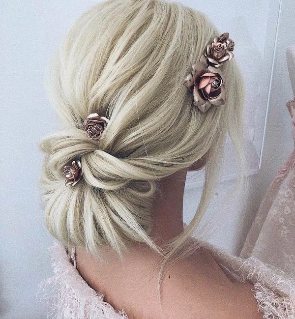 Ще один ажурний варіант коси з низьким пучком, оздобленим квітами. З такою зачіскою можна піти як на весілля, так і на романтичне побачення.