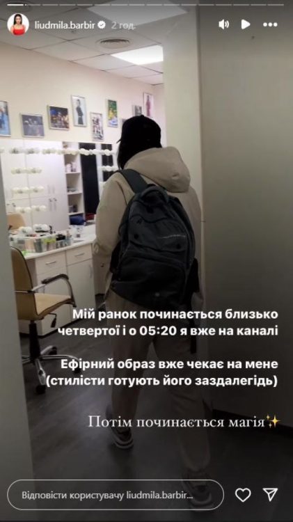 “Мій ранок починається близько четвертої і о 5:20 я вже на каналі. Ефірний образ вже чекає на мене (стилісти готують його заздалегідь). Потім починається магія”, – розповіла Людмила Барбір. Також жінка додала, що перед прямим ефіром їй роблять красиву зачіску та макіяж.