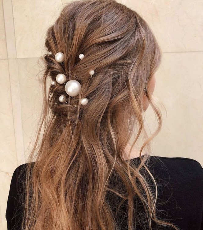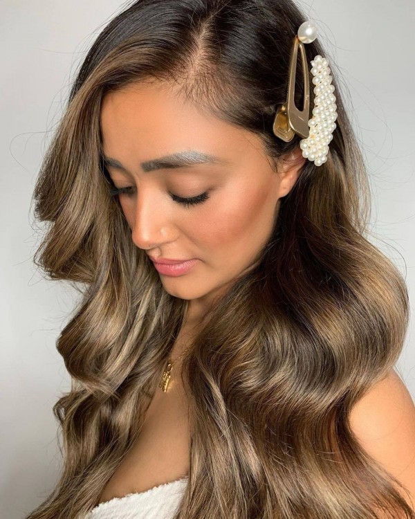 Для урочистого заходу жінкам із середнім та довгим волоссям чудово підійде наймодніша і жіночна зачіска голлівудські хвилі. Створюють її за допомогою бігудів чи плойки з великим діаметром.