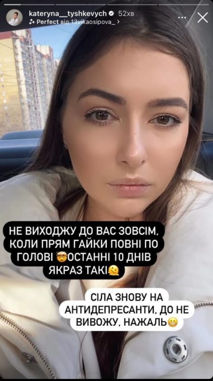 Нещодавно акторка відверто зізналась, що вже декілька днів почувається погано. “Не виходжу до вас зовсім, коли просто гайки повні по голові. Останні 10 днів саме такі”, – заявила Катерина Тишкевич. А ще жінка розповіла, що в неї почало сильно випадати волосся. Акторка здавала всі необхідні аналізи, проте, вони хороші. Катерина Тишкевич наразі консультується з трихологом, адже не знає, як їй позбутися цієї проблеми.