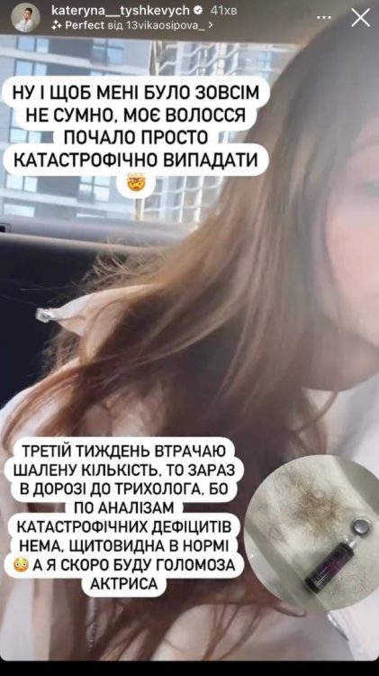 “Ну і щоб мені було зовсім не сумно, моє волосся почало просто катастрофічно випадати. Третій тиждень втрачаю шалену кількість, то зараз у дорозі до трихолога. По аналізах катастрофічних дефіцитів немає, щитовидна в нормі, а я скоро буду голомоза акторка”, – повідомила жінка.