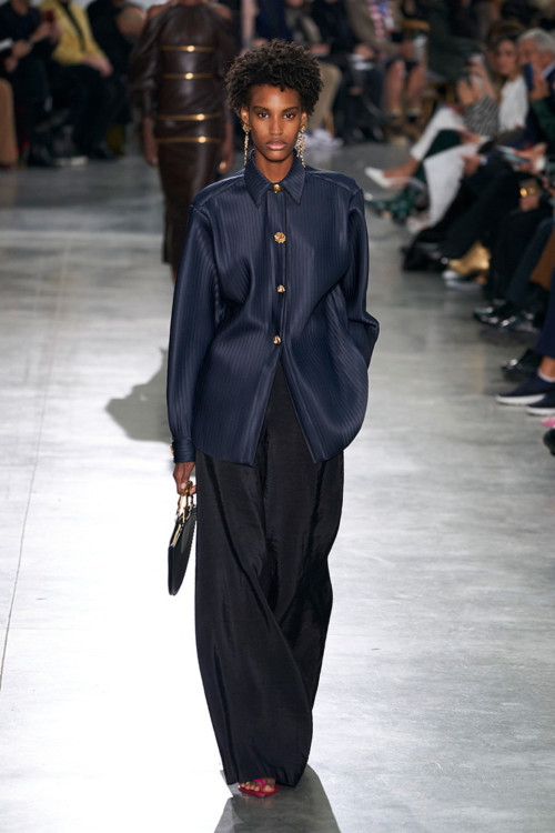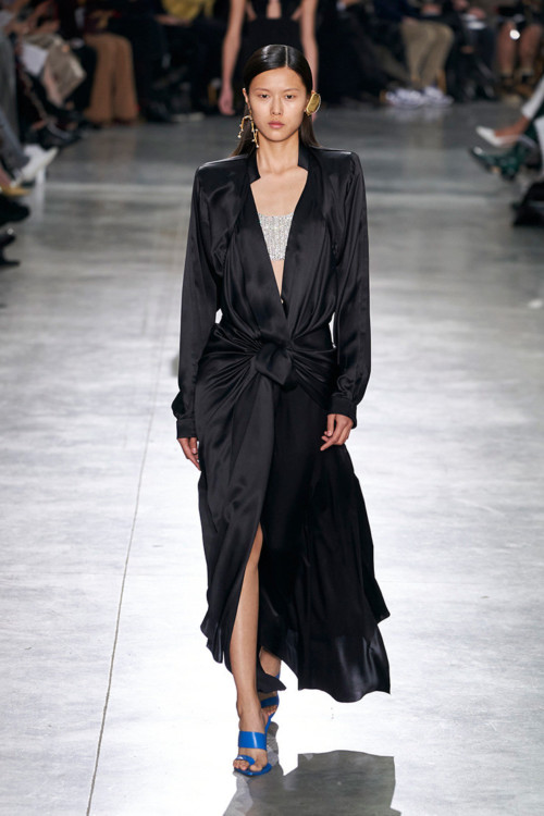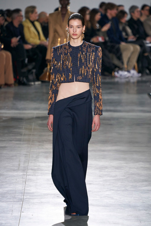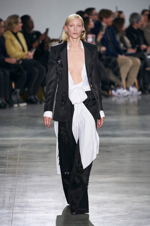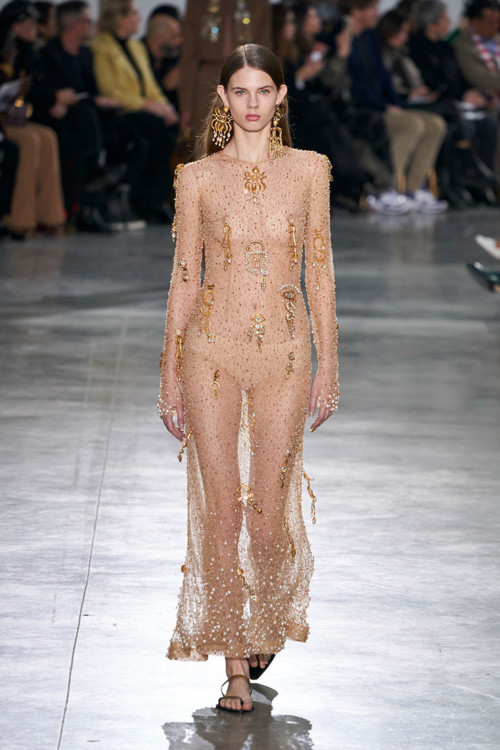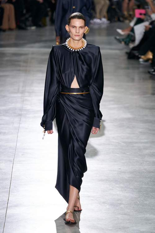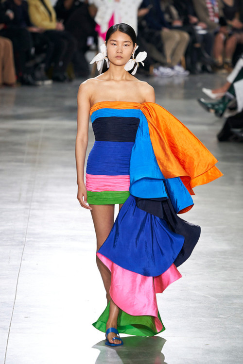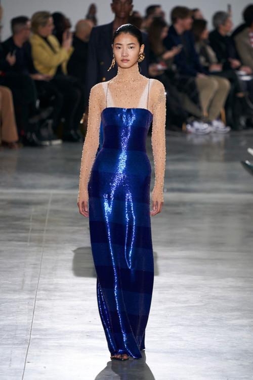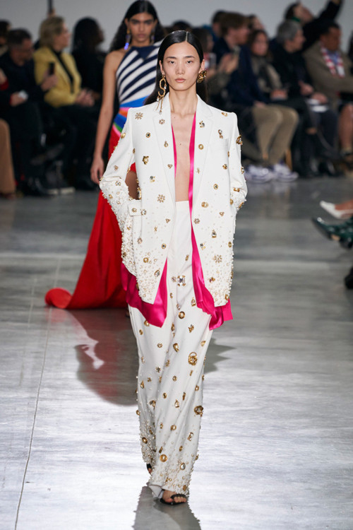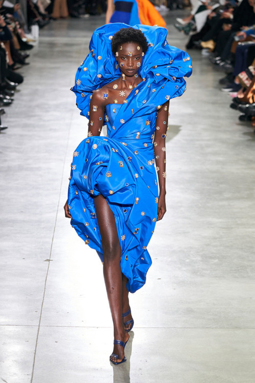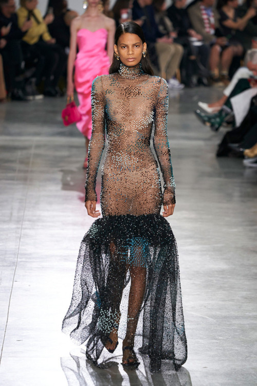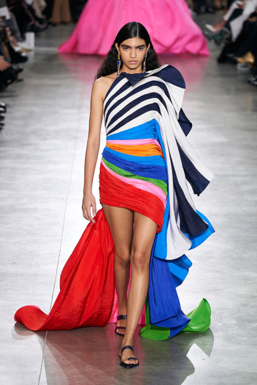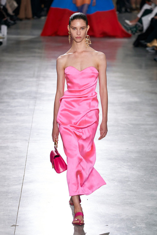 Про витоки нагадує лише пара суконь відтінку shocking pink. В іншому Розберрі йде своїм шляхом, але дуже по-кутюрному: «голі» сукні з блискучою обробкою змінюються іншими з майстерним драпіруванням і об’ємними деталями.