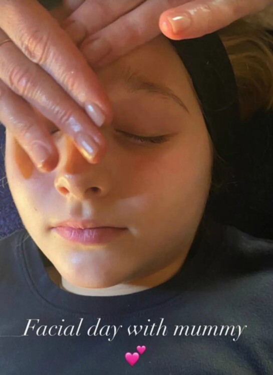 Вікторія показала, як Харпер з комфортом розташувалася на кріслі. У кадрі помітні руки косметолога, який робить дівчинці масаж. Її очі прикриті від задоволення: вона явно насолоджується тим, що відбувається. Не дивно, що Вікторія з дитинства привчає доньку до такого догляду. Сама дизайнер обожнює робити б’юті-процедури і часто розповідає шанувальникам про свій багатий досвід у цій частині.