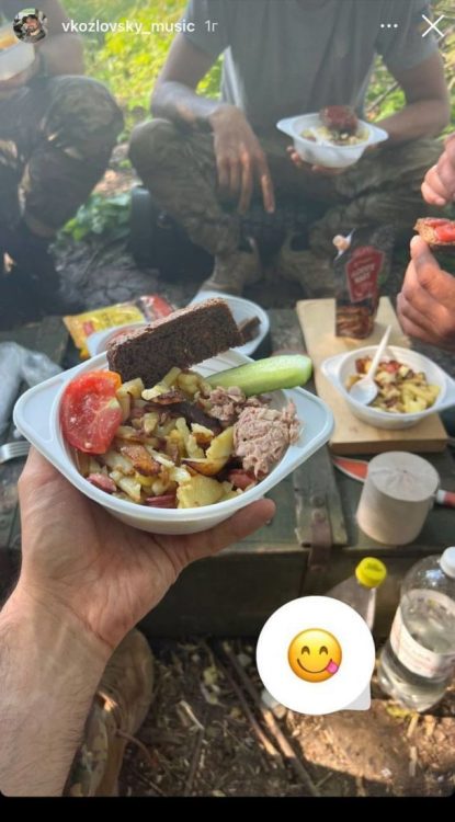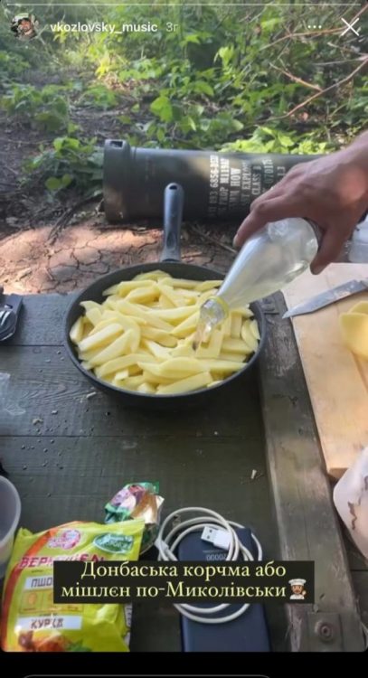 В Instagram-stories Віталій Козловський запостив кадри, на яких продемонстрував обід, приготовлений в польових умовах. Чоловік та його побратими організували польову кухню серед лісопосадки. Вони смажили картоплю з м’ясом. Віталій Козловський похизувався приготовленим обідом, додавши смайлика, який показує задоволення від їжі.