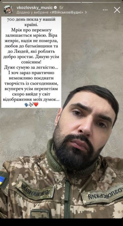 Згодом його перевели в інший підрозділ. Нещодавно виконавець відверто розповів про свою службу в ЗСУ. В Instagram-stories Віталій Козловський зізнався, що сумує за безтурботними днями та сценою. Навіть перебуваючи на фронті, чоловік не забуває приділяти час творчості.
