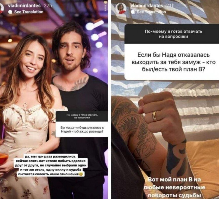 Однак, Володимир Дантес з гумором дав відповідь на запитання. За його словами, подружжя вже тричі розлучалось. Також артист прокоментував ще одне цікаве запитання. Хтось поцікавився в чоловіка, що він зробив би, якби Надя Дорофєєва відмовилась виходити за нього заміж.