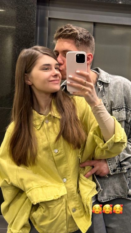 Нову світлину подружжя зробило в ліфті. Фото з дружиною телеведучий залишив без підпису, лише додав три смайлики з поцілунками. Відомо, що наразі закохані перебувають за кордоном. Володимир Остапчук повинен взяти участь у декількох благодійних заходах. Компанію шоумену склала 22-річна дружина.