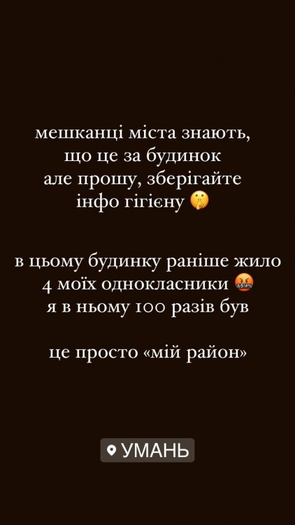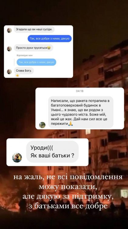 Відомо, що Умань є рідним містом чоловіка. Телеведучий відразу впізнав будинок, який зруйнувала російська ракета. Він відверто розповів, що колись повз нього ходив до школи. Також Володимир Остапчук додав, що в цьому будинку жили його однокласники.