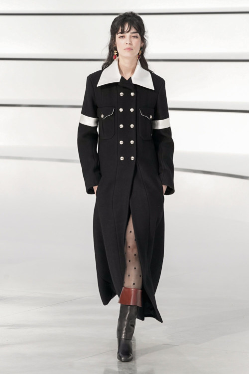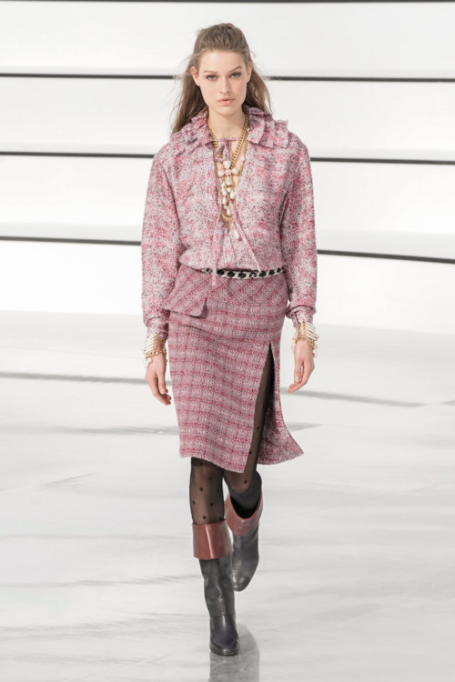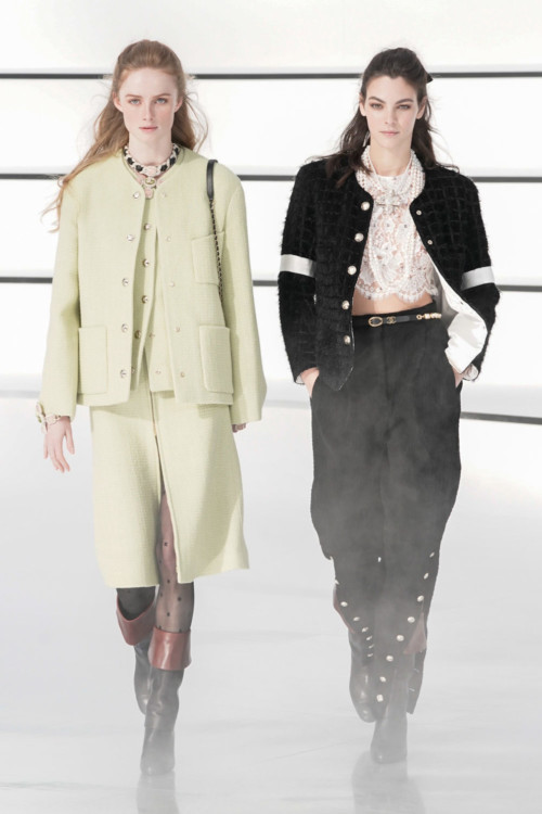 У цій колекції практично немає суконь, зате є широкий вибір штанів з розрізами з боків, які відкривають ефектно ноги при ходьбі, різноманітних твідових жакетів, без яких неможливо уявити Chanel, і спідниць з високими розрізами. Головними на подіумі стали два кольори – чорний і білий, але рідкісні спалахи персикового і блідо-лаймового нагадали, що свобода вибору є у нас завжди.