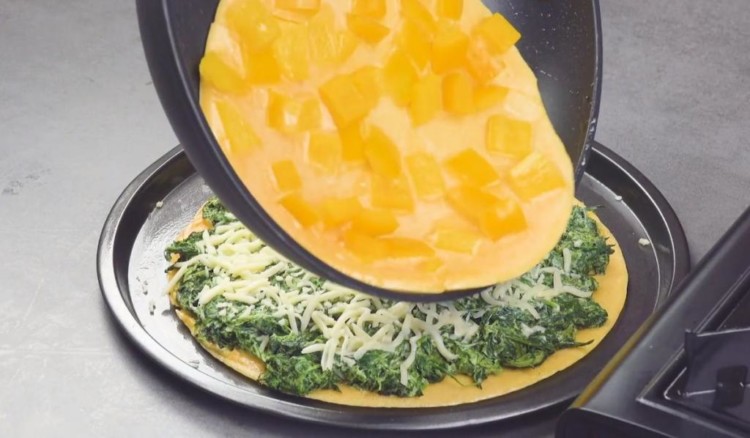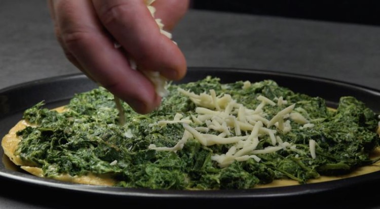 У розігріту сковороду з антипригарним покриттям викладаємо порцію тіста і формуємо млинець. Посипаємо начинкою зі шпинату, приправляємо мускатним горіхом. Накриваємо кришкою і готуємо на повільному вогні. Готовий млинець викладаємо на деко для запікання і посипаємо моцарелою.