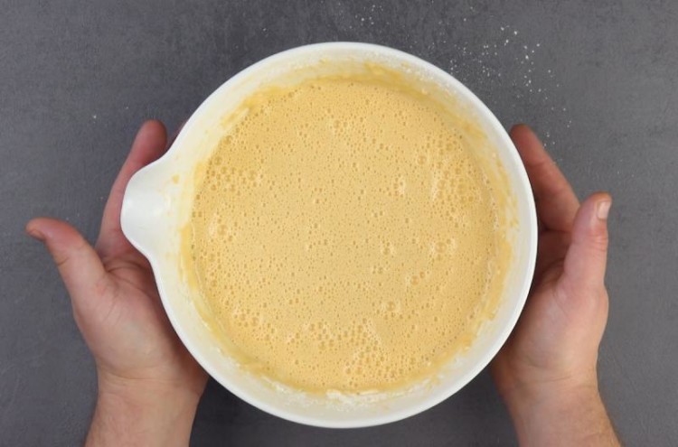 Приготуємо омлет. Нам знадобиться 12 яєць, 250 г вершкового сиру і 250 г борошна. Замішуємо тісто, додаємо до смаку сіль і перець. З цієї кількості тіста у нас вийде 6 млинців.
