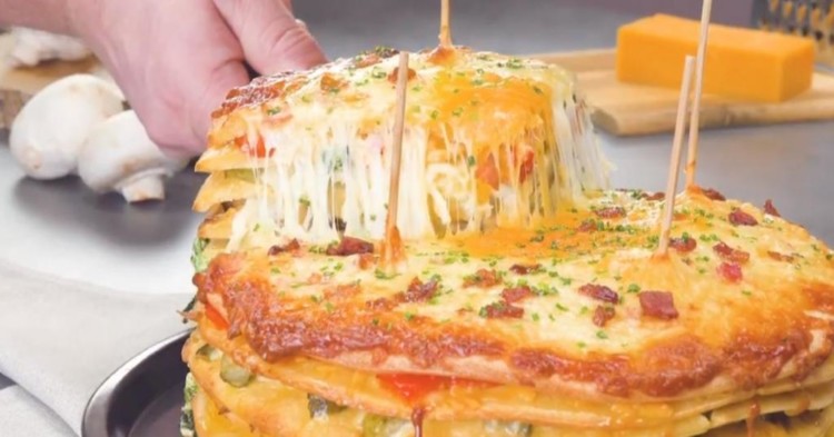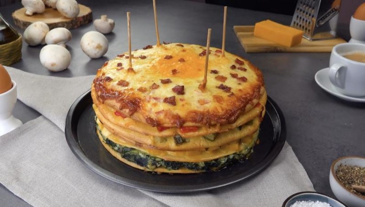 Високий пиріг з омлету, яким можна нагодувати велику сім’ю: кожен шар – різна начинка