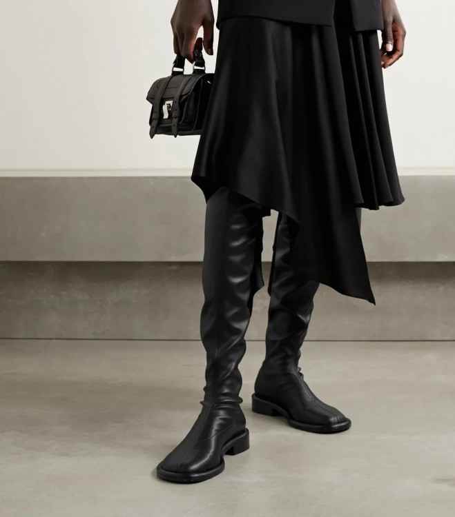 Облягаючі ботфорти – одна з головних тенденцій на осінь 2021. Зверніть увагу на гладку шкіру і довжину до середини стегна, щоб вписатися в цей бездоганний тренд.