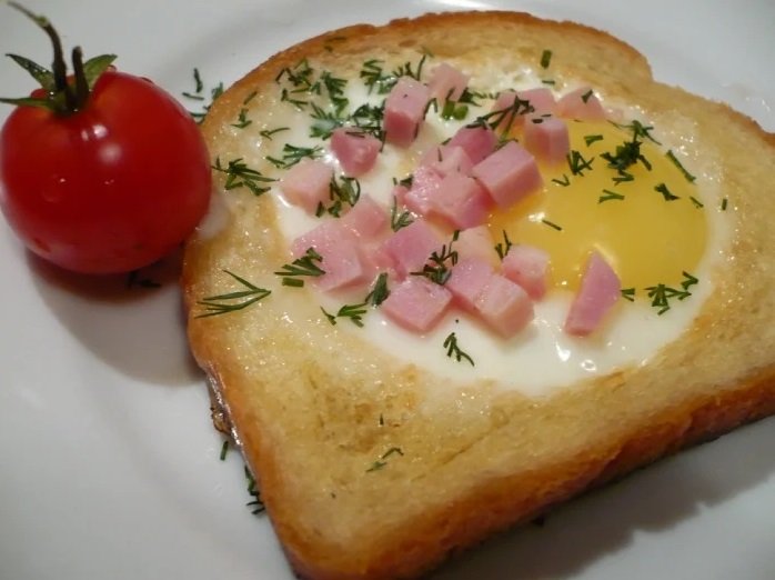 Яєчня в хлібі готова! Викладайте її на тарілку і насолоджуйтеся сніданком.
