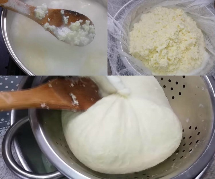 Залийте сир гарячим молоком і поставте на повільний вогонь, проваріть протягом 10 хвилин. Потім викладіть масу в друшляк, застелений марлею, скрутіть щільно краї джгутом і гарненько відіжміть сироватку.