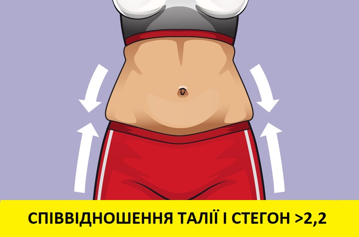 Стегна. Щоб зрозуміти, чи є у вас зайва вага в цій області, необхідно порахувати співвідношення об’єму талії і стегон (ОТБ). За даними Всесвітньої організації охорони здоров’я , ідеальний ОТБ становить 2,3 см і менше для чоловіків і 2,2 см і менше для жінок.