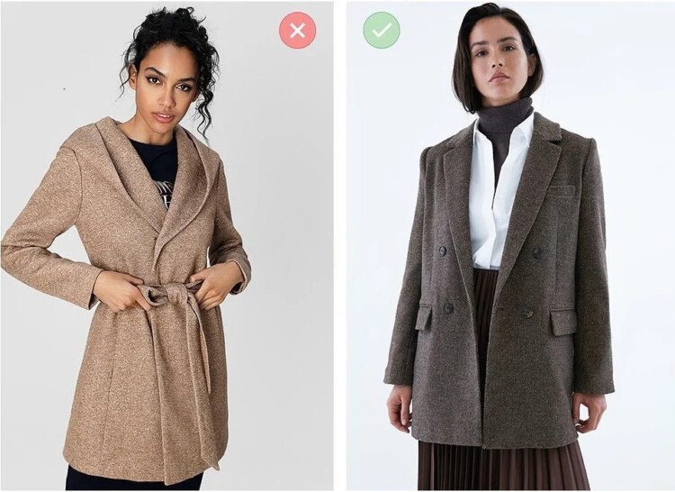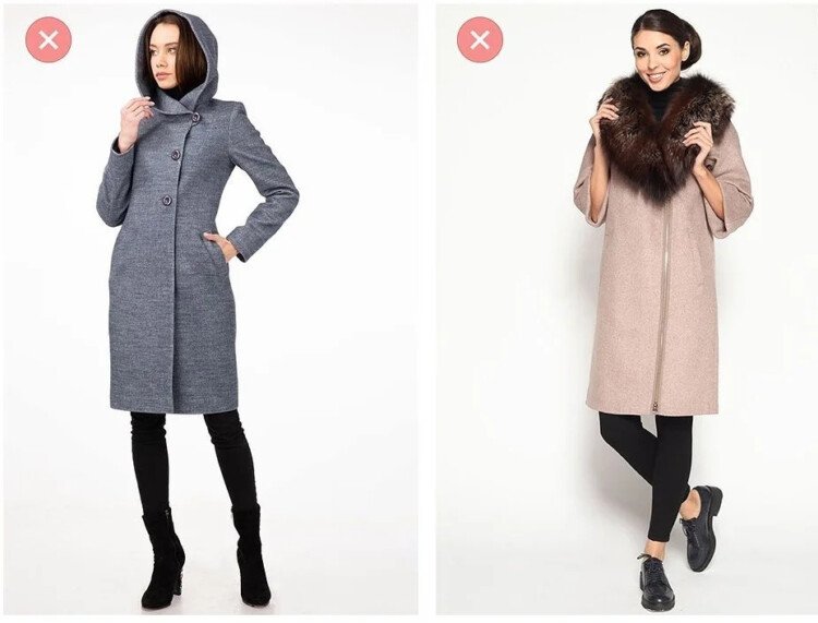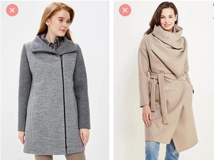 Ще декілька слів про дизайн. Уникайте моделей пальто складного крою, особливо комбінованих (як на фото зліва, де рукава і “тіло” пошиті з різних матеріалів). Також не актуальним у цьому сезоні комір-каскад, як на фото праворуч. Такі фасони не виглядають сучасно і нікого не прикрашають.