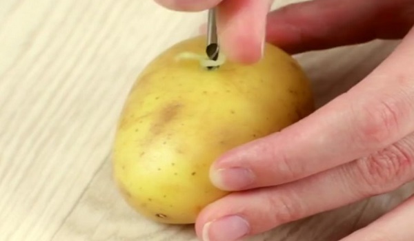 Візьміть картоплю і за допомогою дрилі зробіть в ній отвір такого розміру, щоб туди помістилася ніжка троянди. Отвір має бути невеликим, щоб троянда не втрачала стійкість.