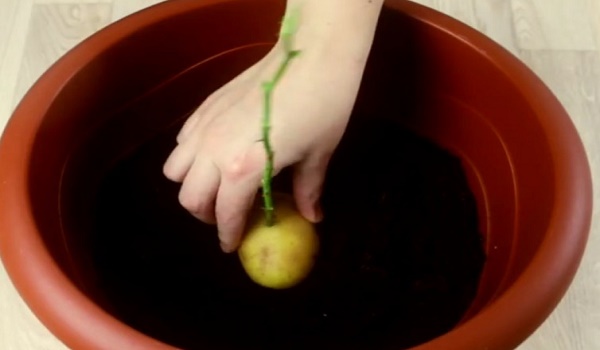 Візьміть горщик і насипте в нього землю, товщина шару 5 см. Помістіть картоплю з трояндою в землю і заповніть нею горщик.