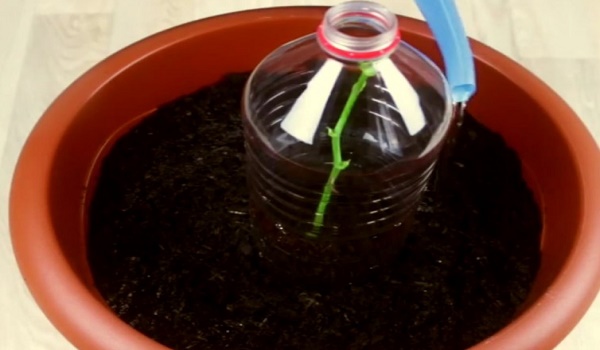 Відріжте нижню частину пластикової пляшки, а верхньою накрийте ніжку троянди. Так ви досягнете парникового ефекту. Щоб не заливати водою саму ніжку, лийте рідину навколо пластикової пляшки.