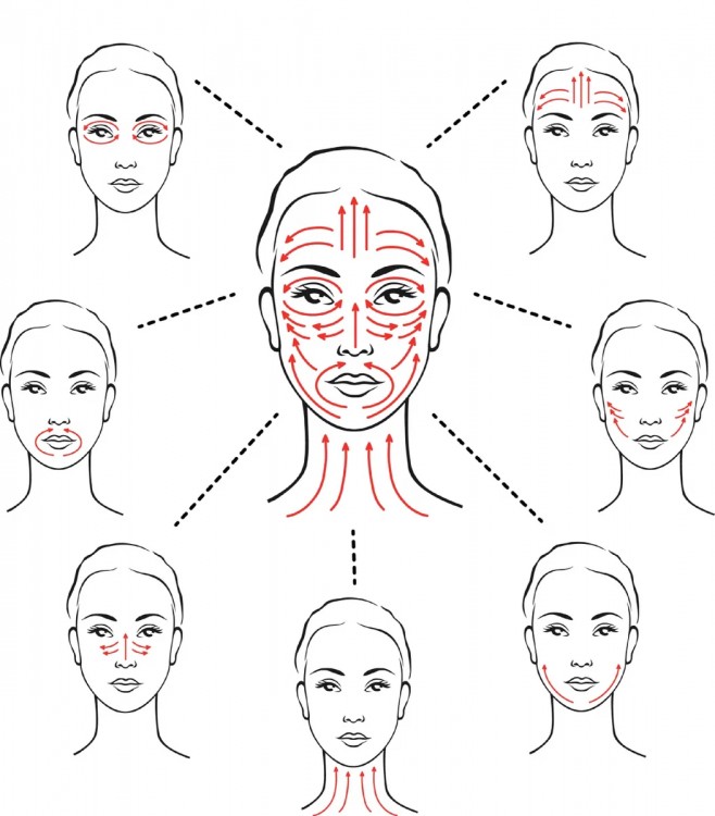 Для початку очистіть шкіру обличчя і рук, приберіть волосся і прийміть зручне положення перед дзеркалом. Потім нанесіть трохи крему і почніть плавно розминати обличчя по цих масажних лініях: