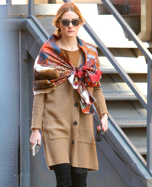 Один з найбільш незвичайних і нерозтиражованих способів зав’язати шарф може зіграти важливу роль у створенні стильного образу. Олівія Палермо перетворила звичайний широкий шарф (правда, прикрашений облямівкою з хутра) в шаль, яку одягла просто поверх пальто. Модель створила з кінців шарфа витончений, але міцний бант. Є й інший спосіб закріпити шаль на плечах: зав’язати недбалий вузол на кінцях.