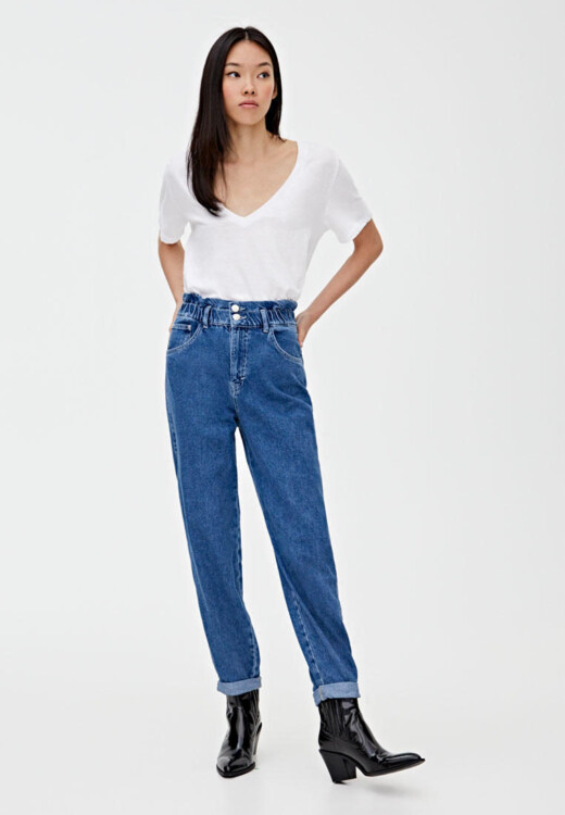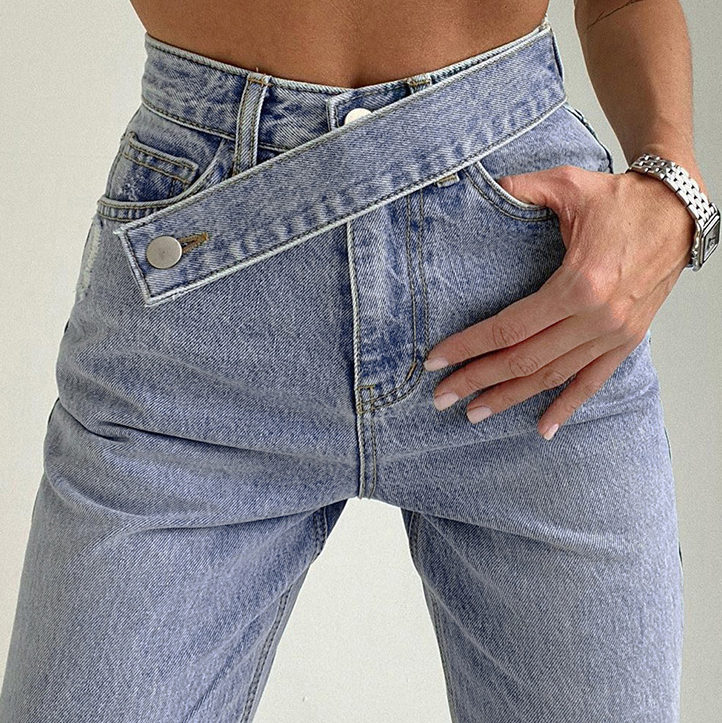 Ще одні незвичайні джинси – модель з асиметричним поясом. Отримавши популярність в мережі інстаграм, ці джинси сподобалися дизайнерам брендів мас-маркету. Носіть їх з кроп-топами або ж заправляйте футболки і сорочки всередину, щоб пояс залишався на виду.