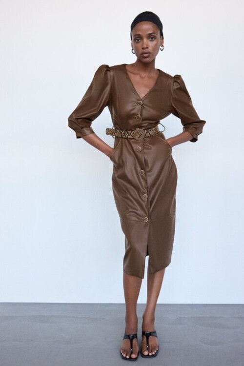 У шкірі можна знайти різні фасони: від суконь-сорочок до варіантів міді з v-подібним вирізом і рукавами-ліхтариками. Струнким і високим жінкам радимо спробувати довжину до коліна і нижче, щоб підкреслити довгі ноги. Дівчатам з нижчим ростом – ідеально підійде довжина вище коліна.