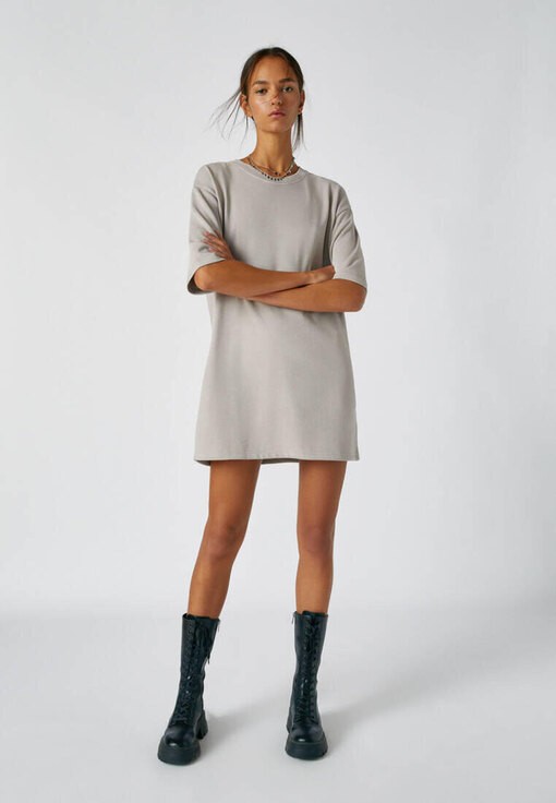 Якщо дрес-код допускає casual-стиль, то сукня-футболка виручить вас, коли зовсім не буде часу на збори. Все, що вам потрібно – грубі черевики на шнурівці, невеликий ланцюжок або кулон, а також шкіряна косуха.