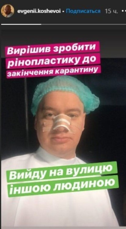 “Вирішив зробити ринопластику до закінчення карантину. Вийду на вулицю іншою людиною”, – підкреслив Євген.