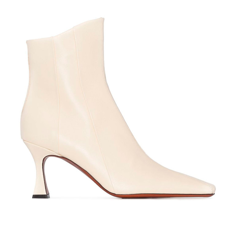 Для походу в театр або на урочистий захід необов’язково одягати сукню – елегантні білі штани стануть відмінною заміною. Доповніть їх приталеним чорним двобортним жакетом з фігурними ґудзиками і ботильйонами з квадратним мисом.