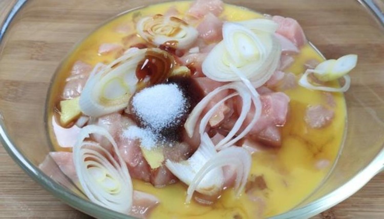 Збийте в мисці яйце. Полийте м’ясо. Додайте цибулю і імбир.