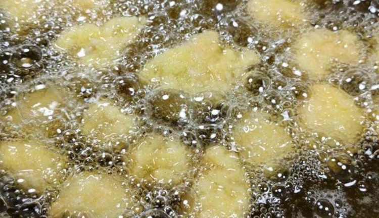 Розігрійте в сковороді велику кількість соняшникової олії. Опустіть туди шматочки курячої грудки. Обсмажуйте їх на маленькому вогні до отримання золотистого кольору з одного боку. Це займе буквально пару хвилин. Переверніть на іншу сторону. Грудка повинна покритися красивою хрусткою скоринкою. Зніміть з вогню.