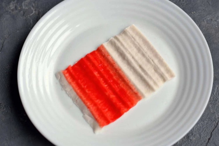 Крабові палички розморозьте до м’якого стану. Кожну паличку розгорніть у рівне полотно. Якщо палички важко розвертаються, їх на кілька хвилин можна залити теплою водою.