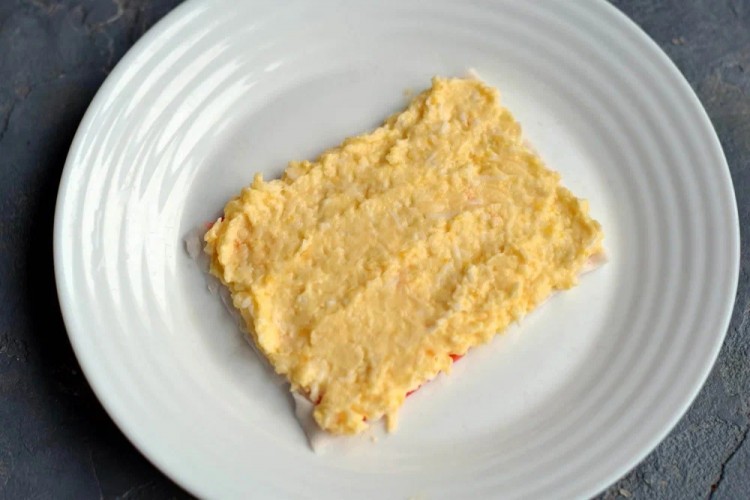 Далі викладіть другий листок крабових паличок, також змастіть його сирною начинкою.