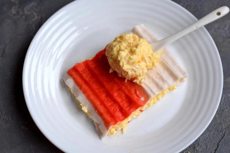Пропонуємо вашій увазі цікавий та оригінальний рецепт торта з крабових паличок. Готується він дуже швидко і просто, з рецептом впорається навіть новачок у кулінарії. Для страви підійдуть виключно якісні крабові палички, які легко розгорнути в полотно. Для начинки використовуємо стружку твердого сиру та жовтків. Прикрашається тортик білками, від цього його часто називають «Снігуронька».