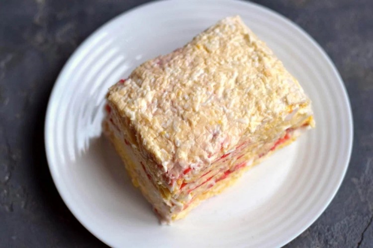 Таким чином сформуйте всі шари торта, доки не закінчаться всі крабові палички та сирна маса.