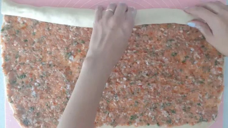 Тісто, що відпочило, розкочуємо в один тонкий прямокутний пласт товщиною приблизно в 2-3 мм. Далі зверху розподіляємо начинку рівномірним шаром, відступивши від одного широкого краю пару-трійку сантиметрів. Тепер загортаємо рулет до краю, від якого робили відступ і защипуємо добре шов, щоб пампушки під час смаження не розповзлися.